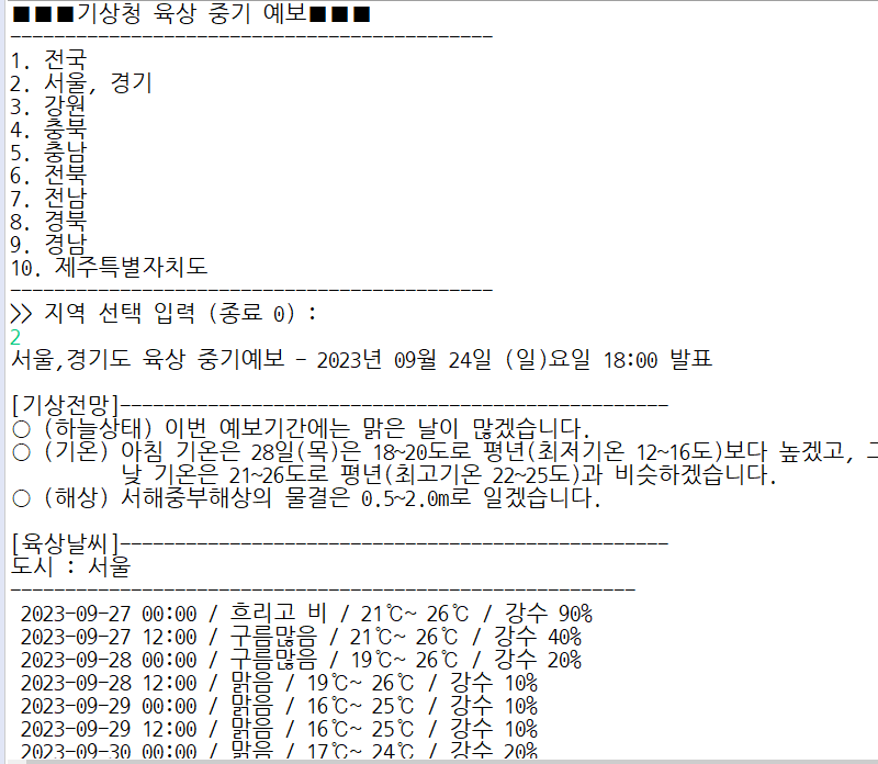 에서 %s 값이 아래 리스트의 값에 따라 지역별 일기예보 정보가 나타나는 것을 확인