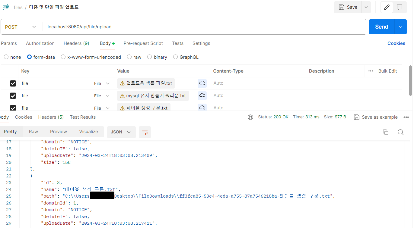 - 이렇게 해서 Part 데이터 타입을 이용한 다중 파일 업로드 다운로드 api를 완성하였다.