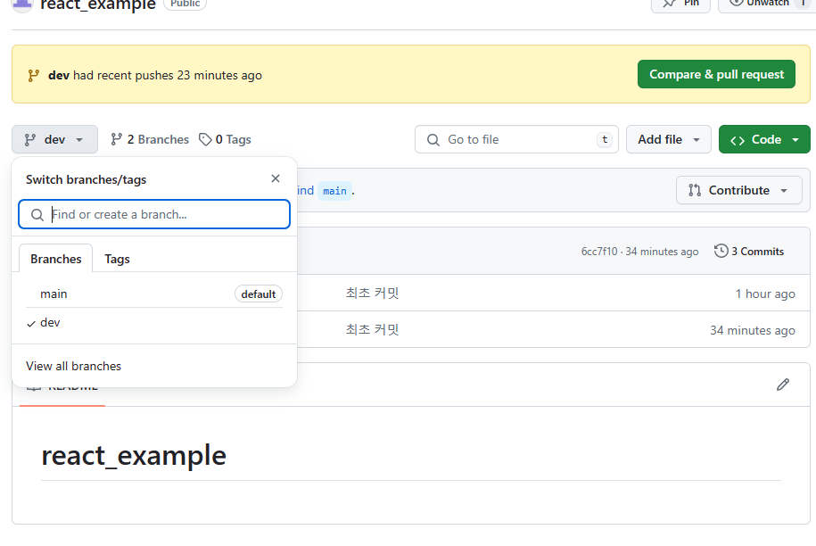 - repository에 "dev" 라는 브랜치가 생성할 준비가 끝났다