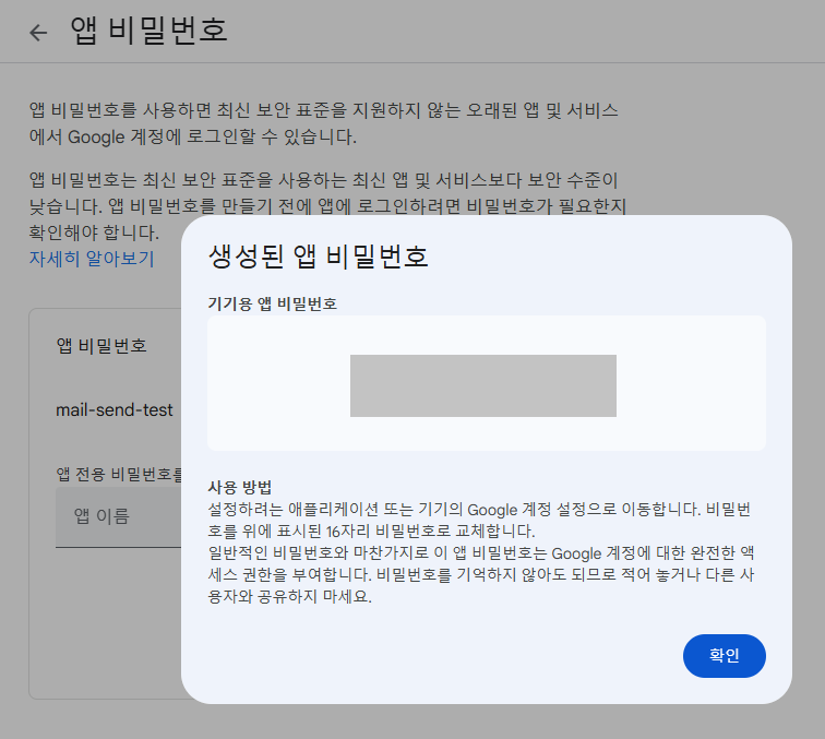 앱 비밀번호가 프로젝트 내 smtp 설정에서 password로 사용될 것이다.