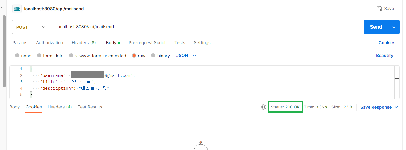※ 처음에 200 ok 인데 왜 메일이 안 왔지 하고 여러 번 보냈었다 그 이유는 맨 처음 모르는 발신자로부터 온 메일이