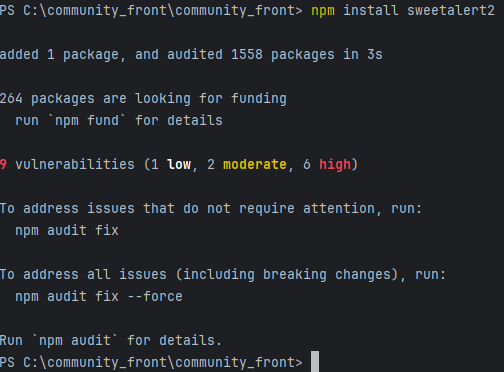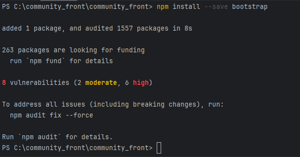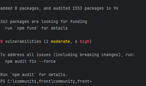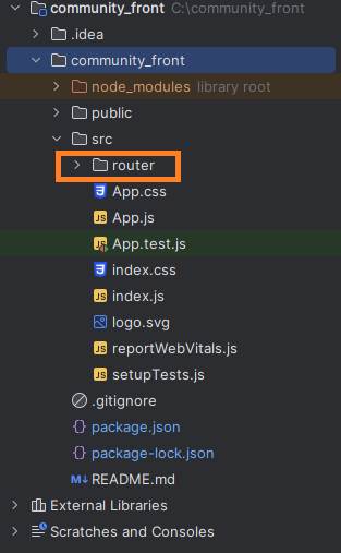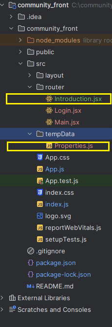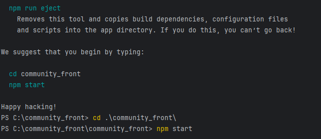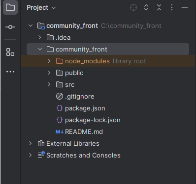- 위에 c:\community_fron\ 경로에 위 사진 처럼 node_modules 등등의 파일이 생기면 react 프로젝트 설치 완료 된 것.