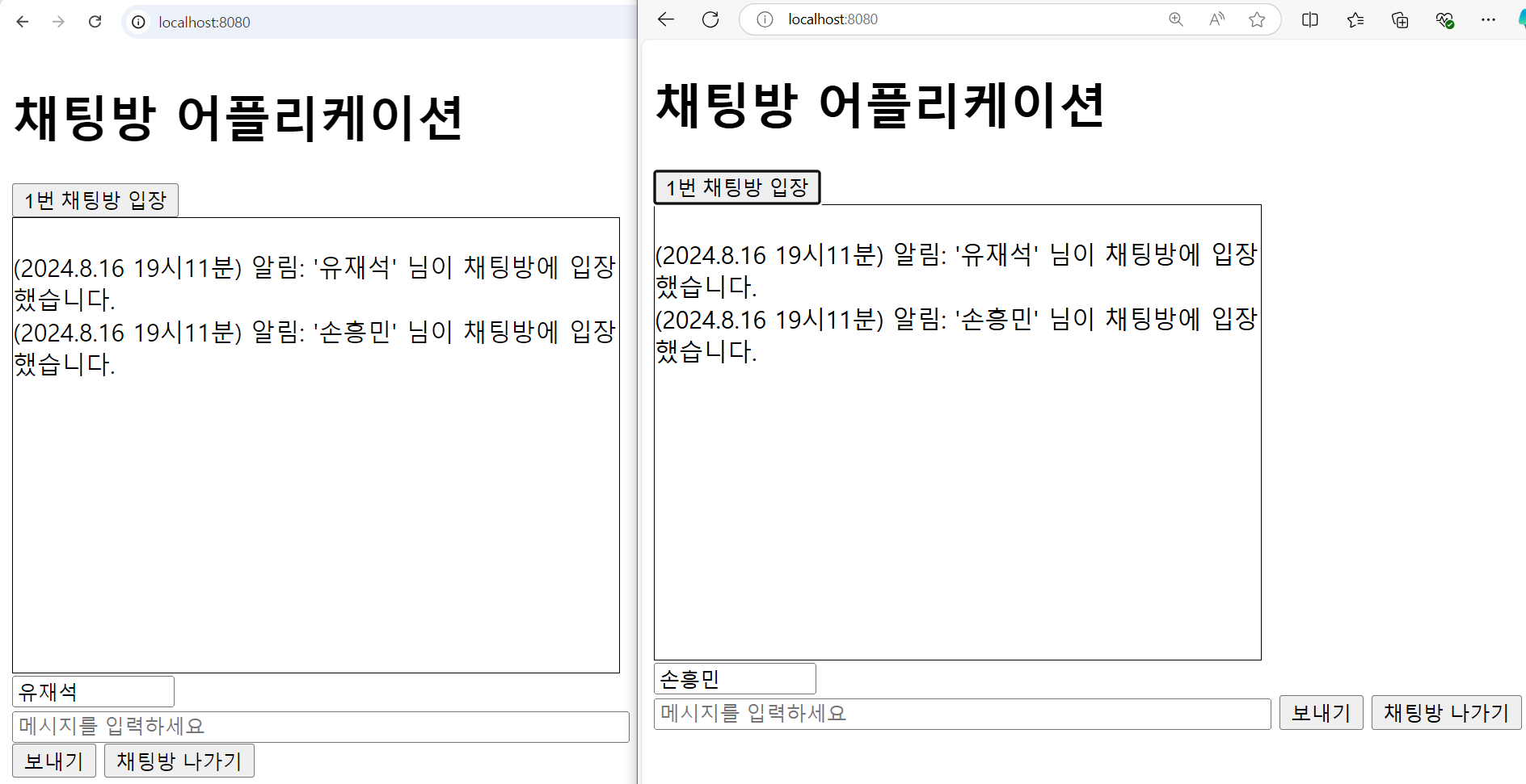 - 웹소켓 연결 성공 시, 종료 시 프론트 웹소켓 이벤트 핸들러로 채팅방 입·퇴장 메시지 해당 채팅방 유저들에게 message send