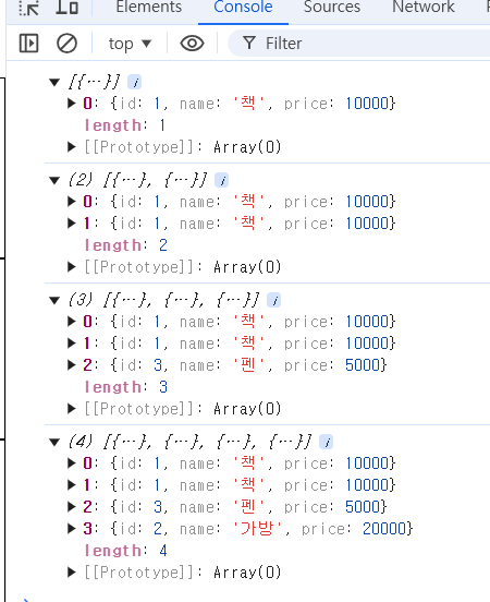 setShoppingCart((prev) => [...prev, item]); // 여기서 prev.push(값) 을 사용하지 않는다 -> .push 는 원본 배열에 변경이 생기기 때문에 위험해서