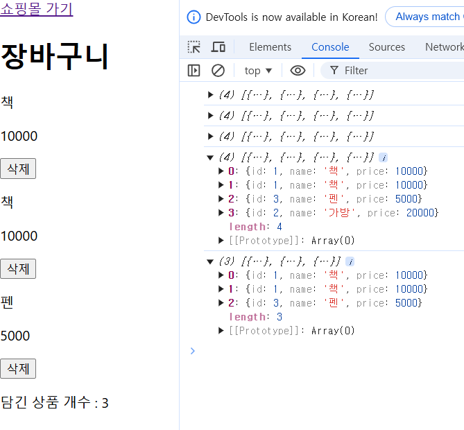 - 상품 '가방' 의 삭제 버튼을 클릭했더니