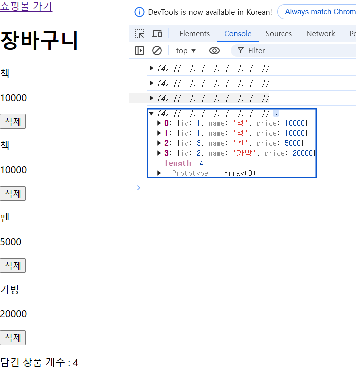 미리 작성해두었기에 콘솔 로그에서 state 에 제대로 값이 추가되는지 확인할 수 있다