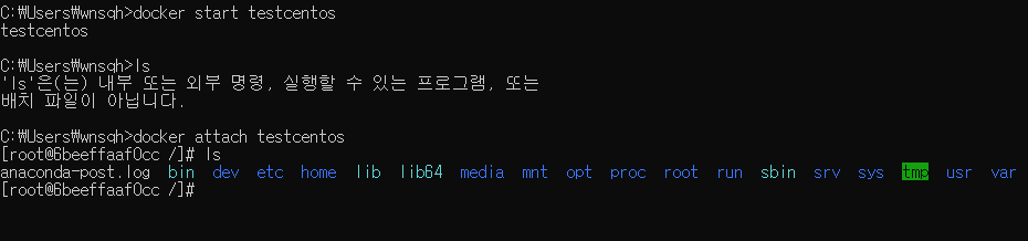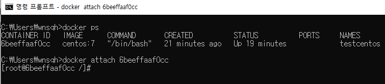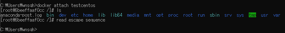 docker attach testcentos // alias 가 testcentos인 컨테이너로 진입