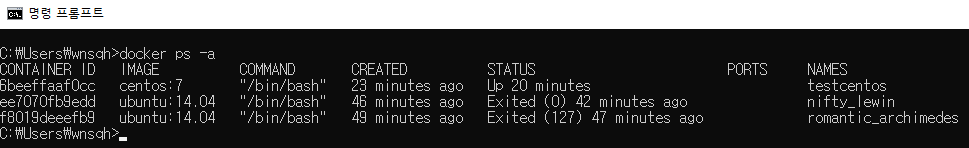 docker start testcentos // alias 가 testcentos인 컨테이너로 시작