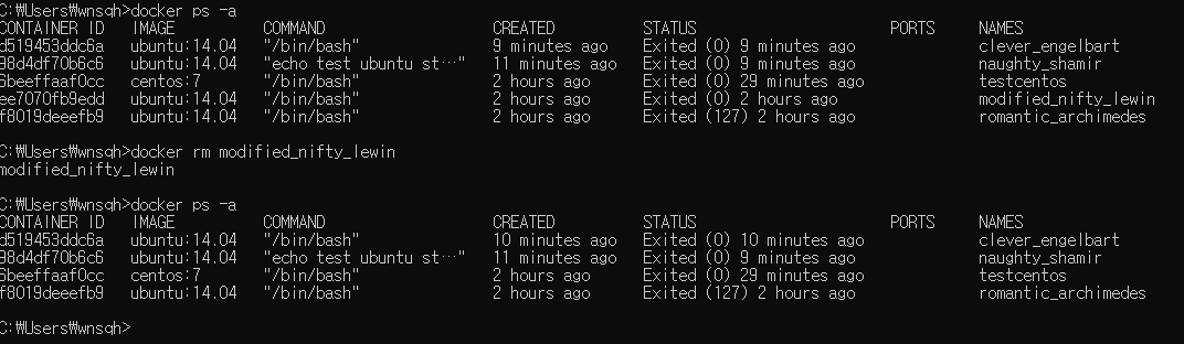 명령어로 modified_nifty_lewin 컨테이너를 삭제하자!
