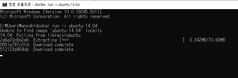 우분투 이미지는 로컬에 존재하지 않기 때문에 도커 이미지 허브에서 다운로드 된다.