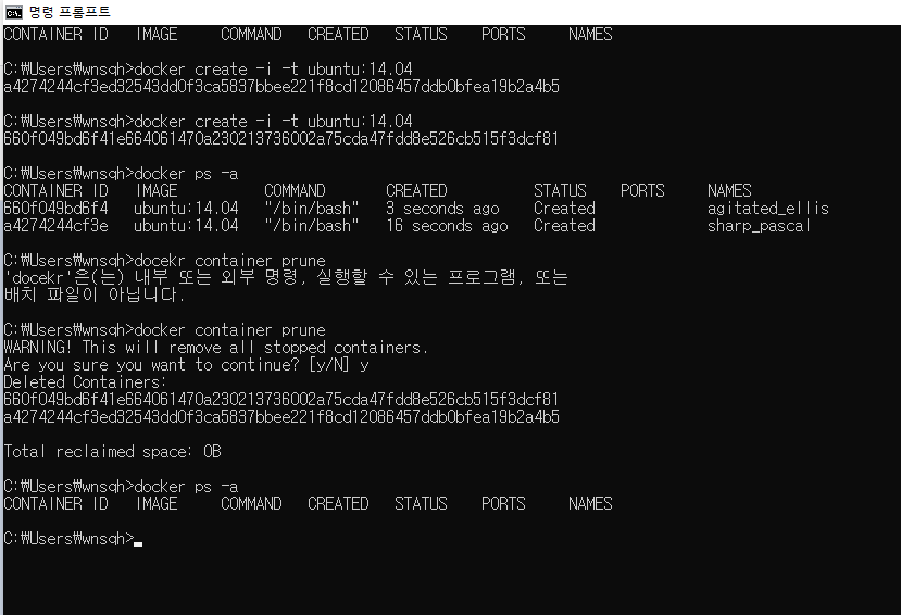테스트 컨테이너를 2개 정도 생성해 docker container prune으로