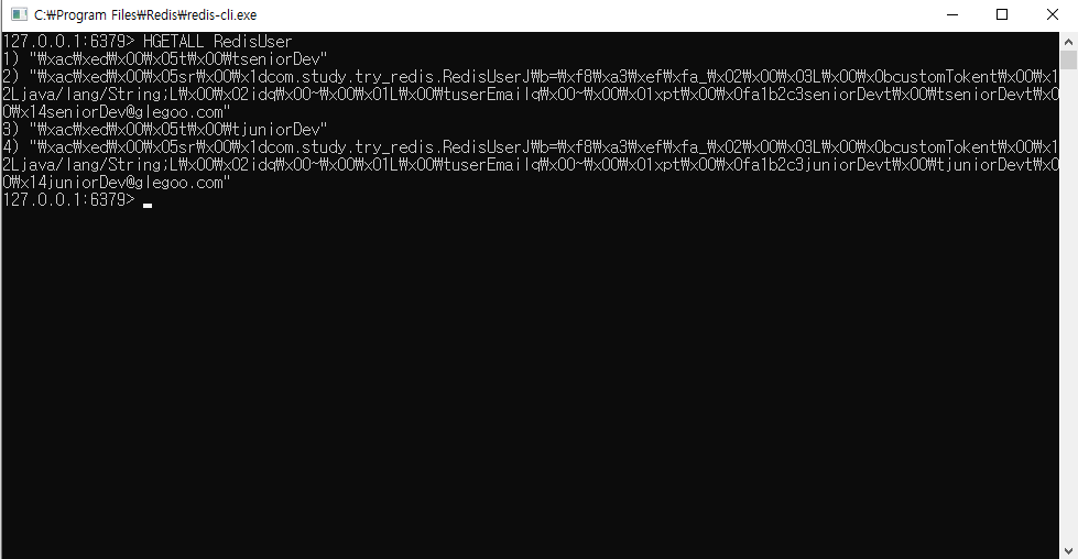 * 이번 테스트에서는 객체를 직렬화하여 넣었기 떄문에 주석처리 해두었다. -> opsForHash를 사용하였다.