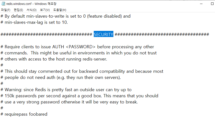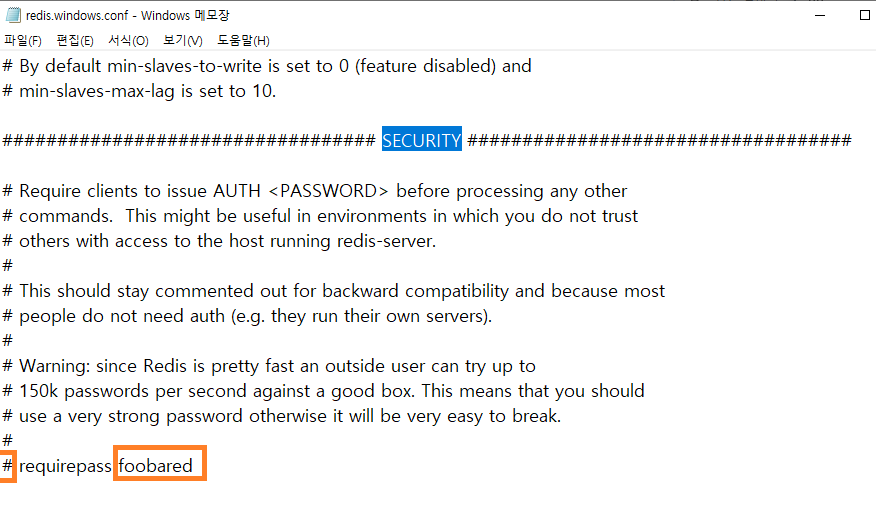 - 위 "# requiredpass foobared" 에서 # 을 지워 주석해제 하고 footbared 자리에 원하는 패스워드 입력하면