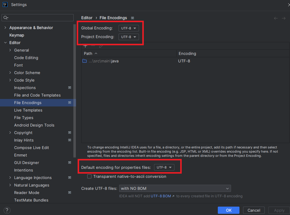 IntelliJ - settings - file Encoding 에서 아래 스크린샷처럼 전부 UTF-8 로 설정해주자!